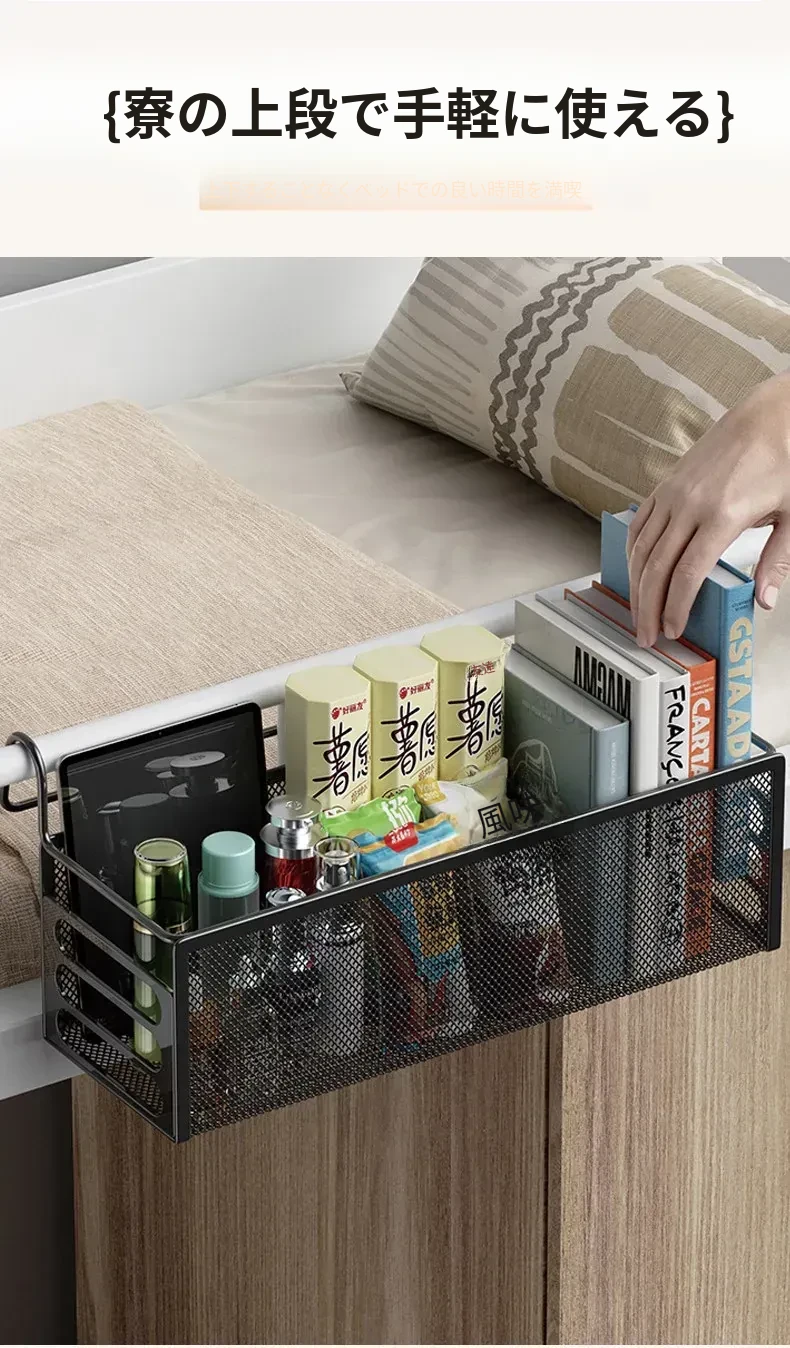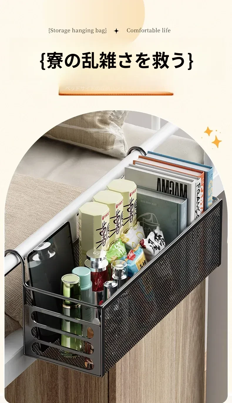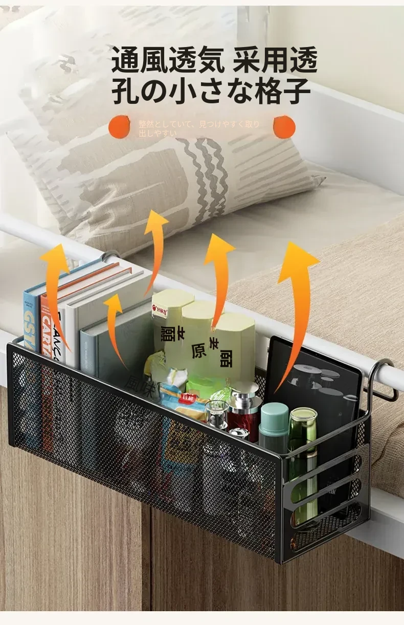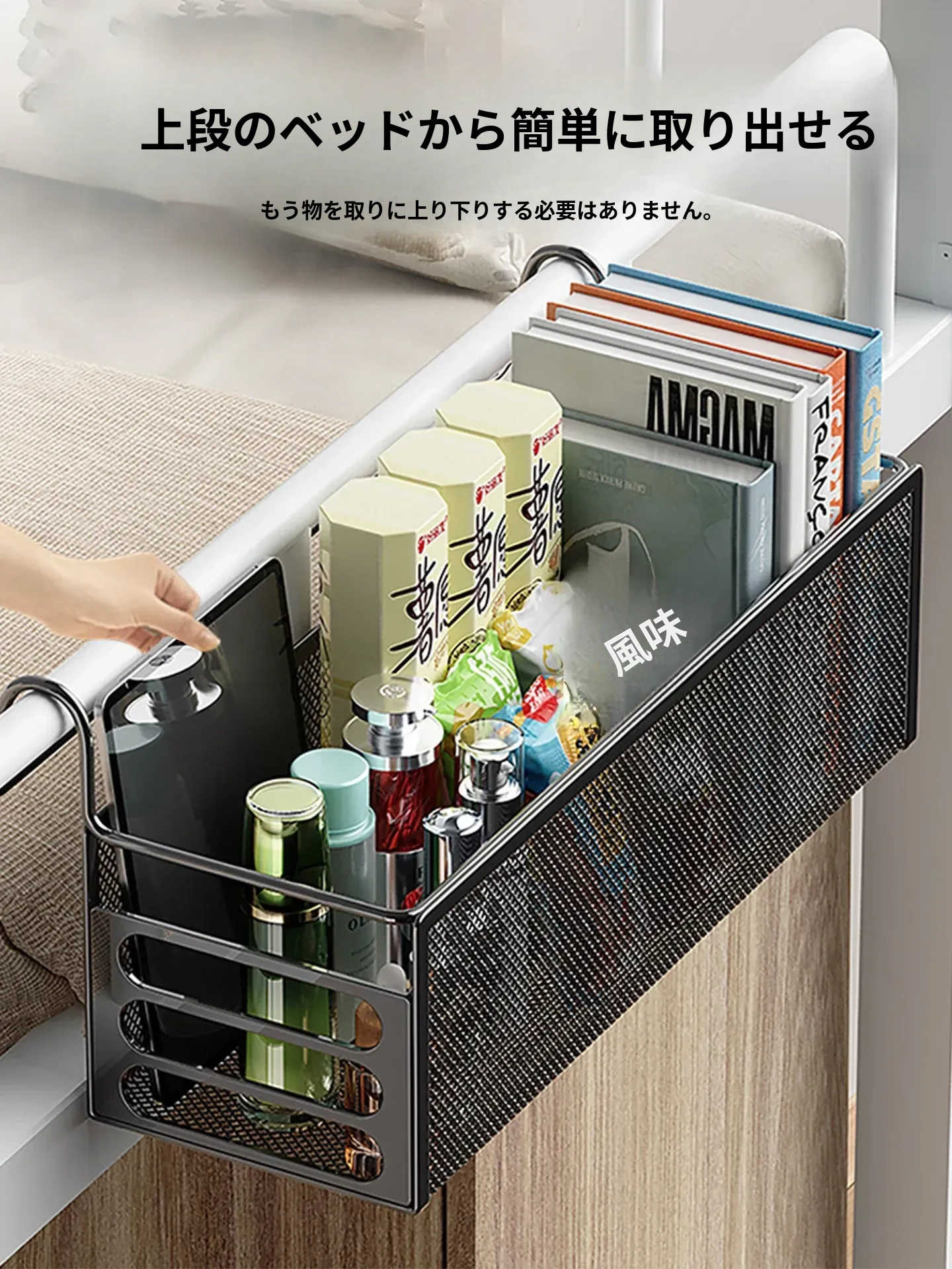 大学生必見!宿舎ベッドサイドハンギングバスケット - 簡単取り付け、穴あけ不要!上下段対応の収納ラックで、お菓子や小物をスッキリ整理。寝室の必需品、便利でおしゃれな収納アイテム!