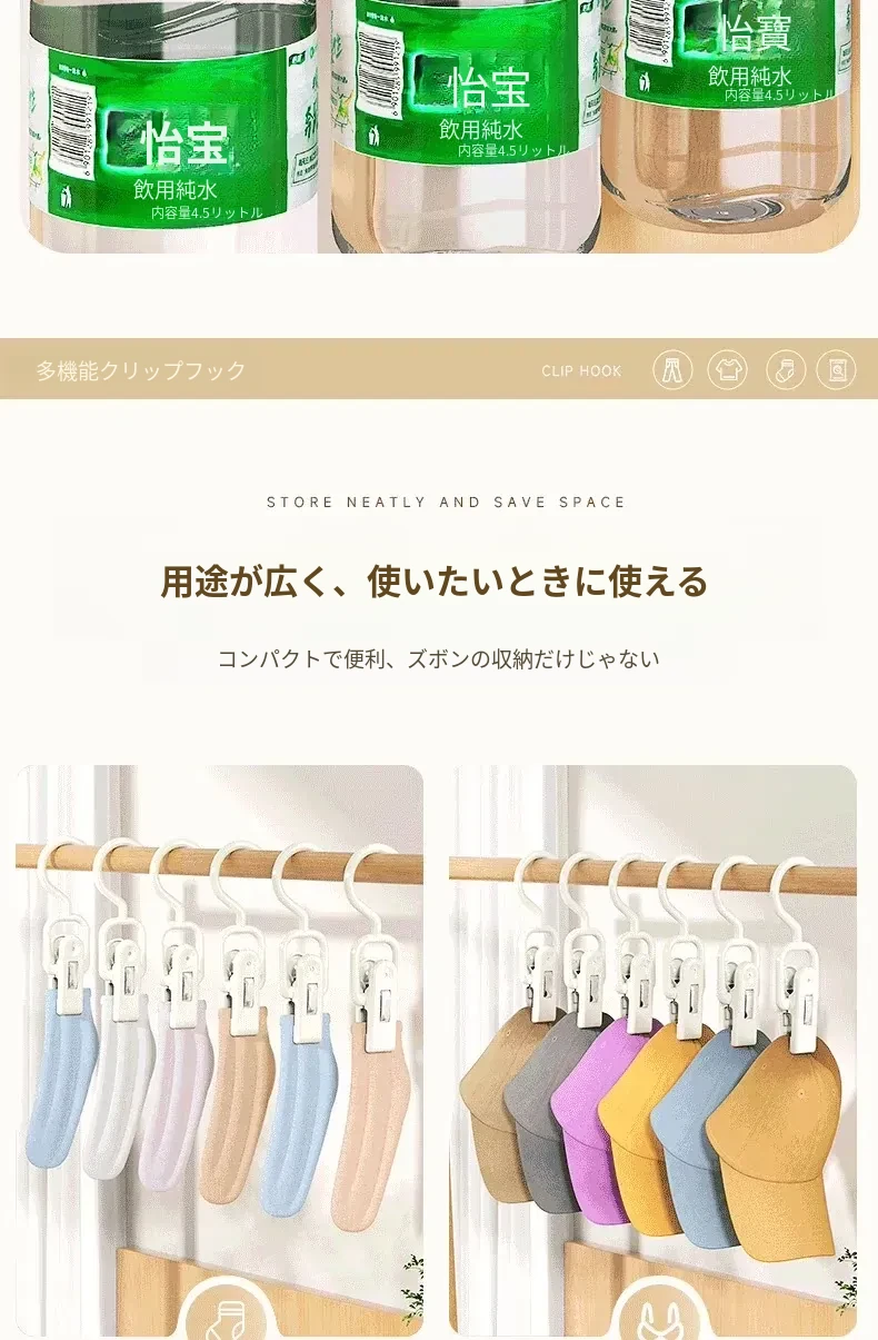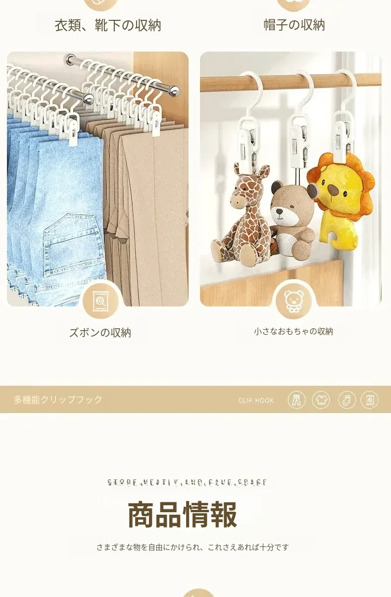 帽子や小物をスッキリ収納!多機能クリップフックで、回転可能な靴下クリップやタオルクリップも完備。おしゃれで便利な収納アイテムで、あなたの生活をもっと快適に!