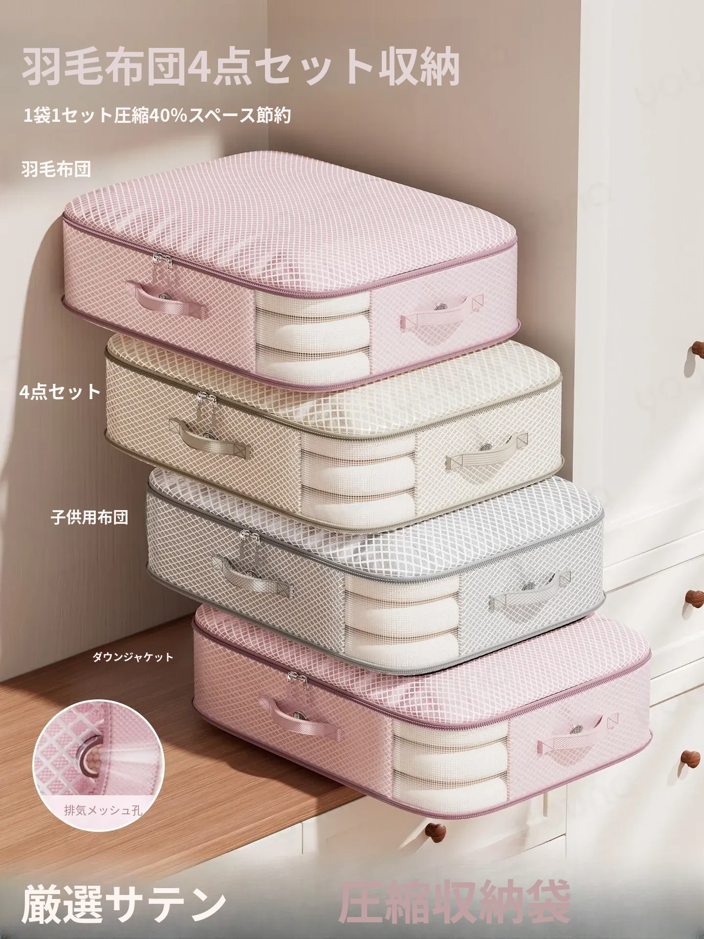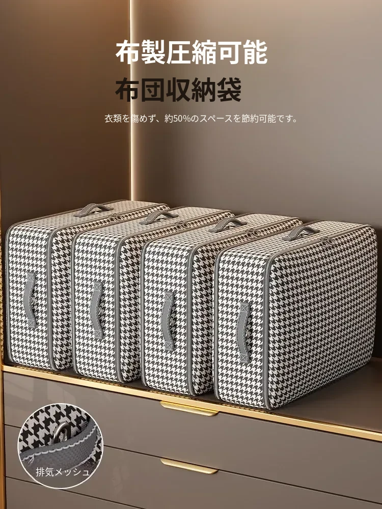季節の衣替えに最適!圧縮ダウン布団4点セット収納バッグ - ほこりを防ぎ、持ち運び便利な収納袋で衣類や布団を整理整頓。クローゼットをスッキリ!