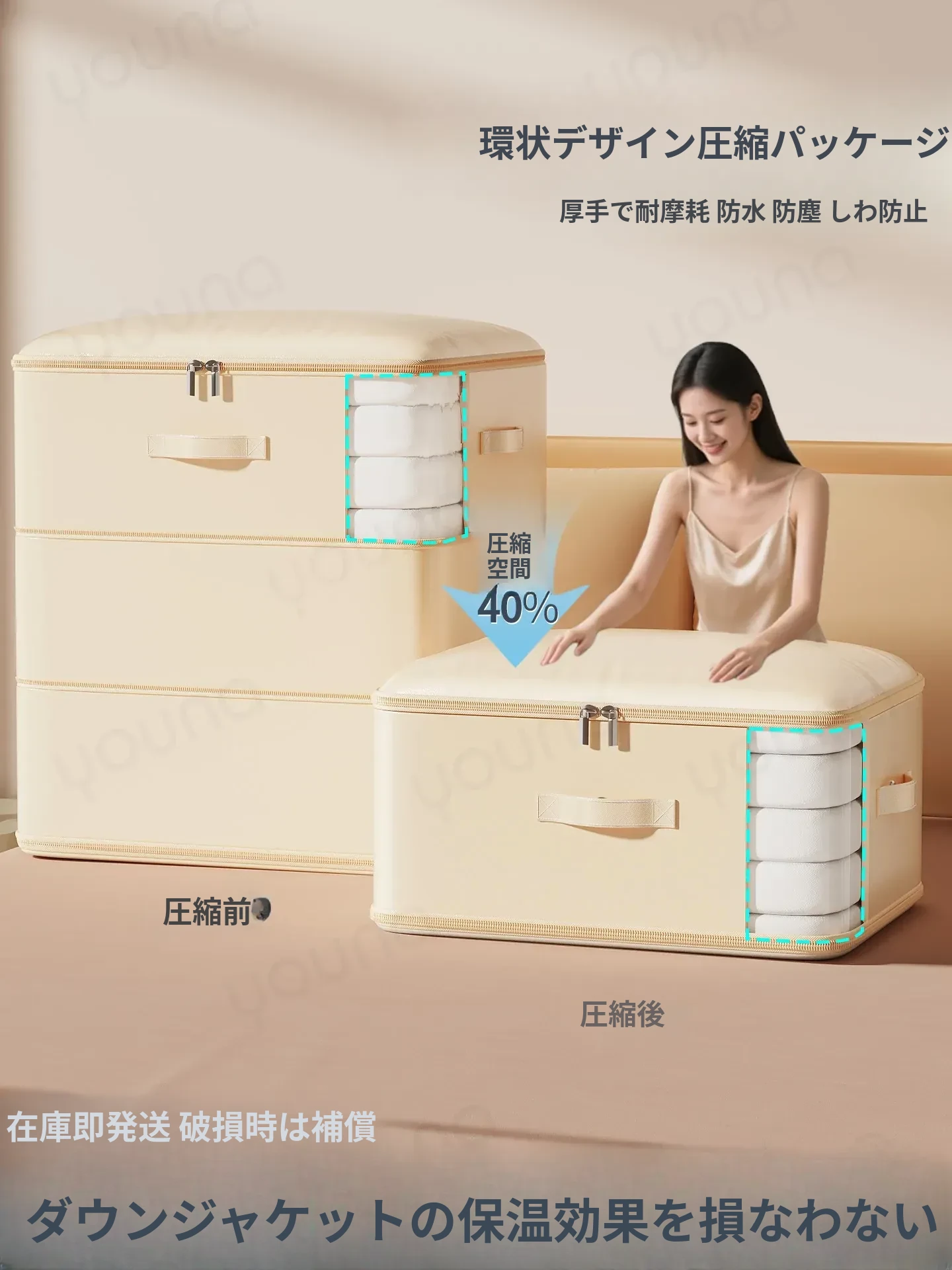 大容量収納バッグ!ダウンコートや布団、衣類をすっきり収納。季節替えも簡単に!シルク布団やダウン布団も整理整頓。スペースを有効活用し、生活をもっと快適に!
